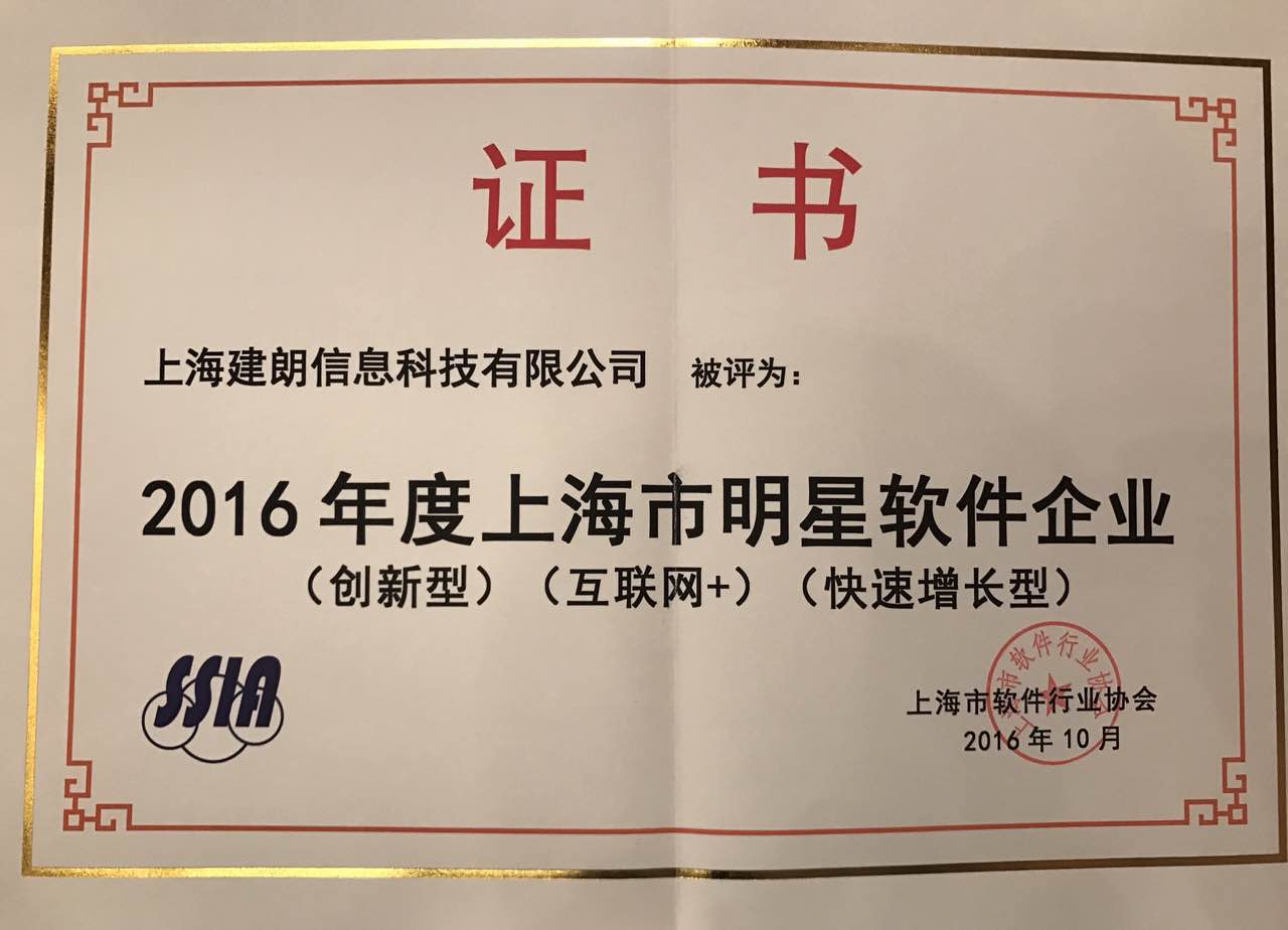 2016年10月27日,上海軟件行業(yè)協(xié)會(huì)在上海國(guó)際會(huì)議中心召開以“創(chuàng)新、服務(wù)、融合”為主題的創(chuàng)新論壇,揭曉了2016年度上海軟件“四名”(名企、名品、名人、名園)評(píng)選結(jié)果。上海建朗信息科技有限公司憑借2015年在軟件領(lǐng)域取得的突出成績(jī),分別榮獲“創(chuàng)新型”、“互聯(lián)網(wǎng)+”、“快速增長(zhǎng)型”三大獎(jiǎng)項(xiàng),更一舉奪得上海軟件名企的稱號(hào)!