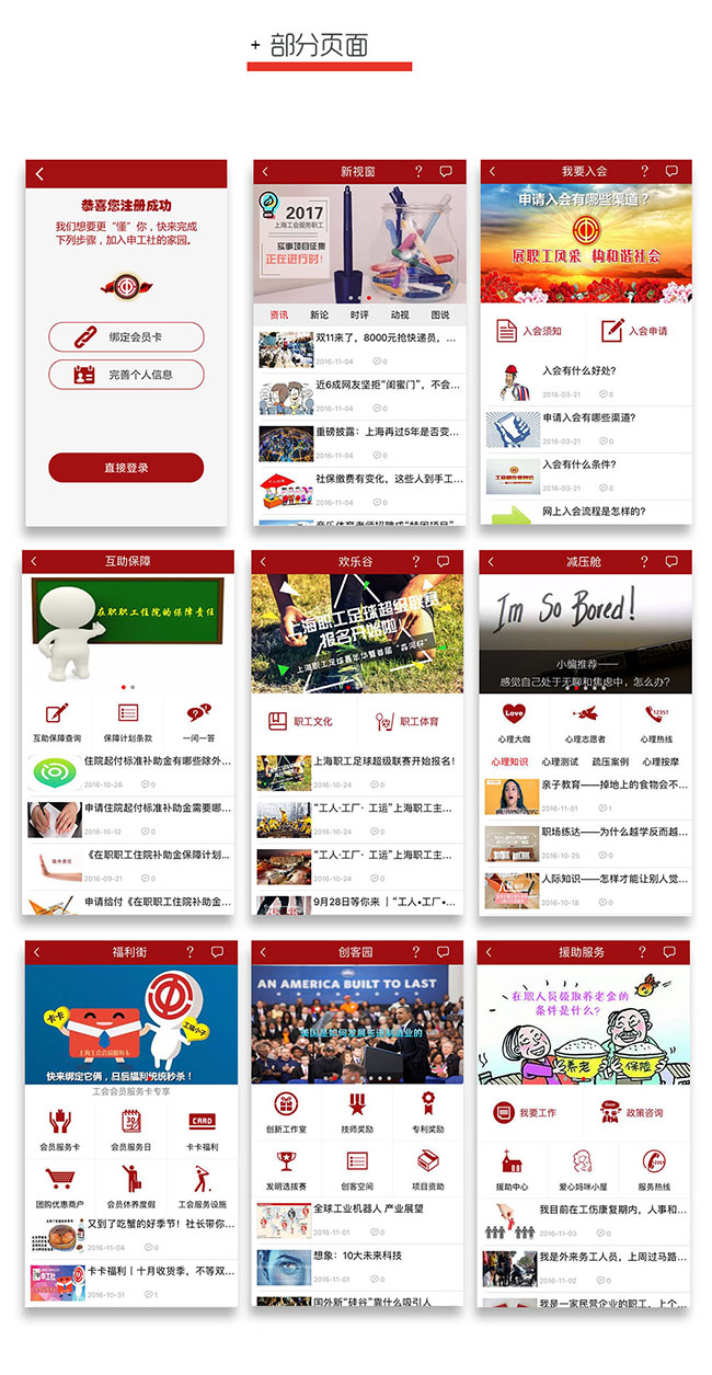 建朗為“申工社”APP設(shè)計(jì)了15個一級目錄、50余個二級目錄,在職工入會、維權(quán)、保障服務(wù)、職業(yè)培訓(xùn)、技能升級、職場心理、文化體育等方面為本市廣大職工提供全方位面對面的線上服務(wù),力求構(gòu)建一個“網(wǎng)上職工之家”。