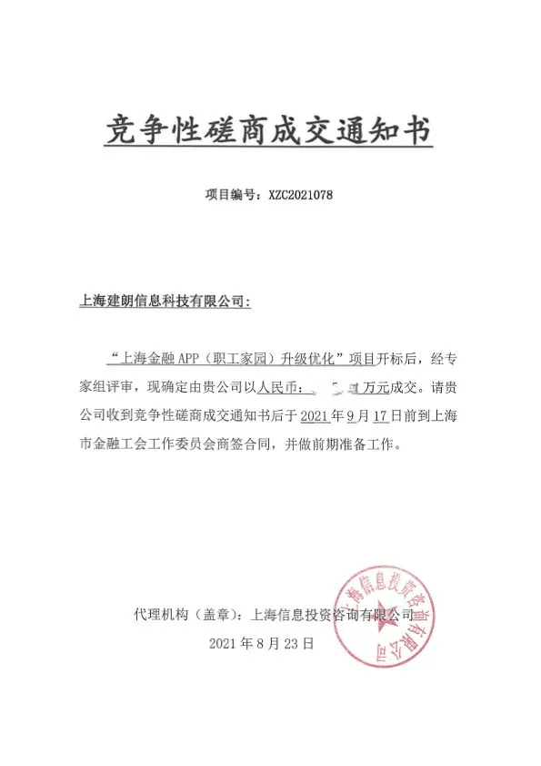熱烈祝賀上海建朗信息科技有限公司于2021年08月23日在參與《“上海金融APP(職工家園)升級(jí)優(yōu)化”》項(xiàng)目中,憑借卓越的行業(yè)競(jìng)爭(zhēng)力與優(yōu)質(zhì)的服務(wù)成功中標(biāo),再一次被選定為上海市金融工會(huì)“金融APP職工家園”的供應(yīng)商;公司將更加有信心提供上乘的技術(shù)能力,更好的服務(wù)客戶。